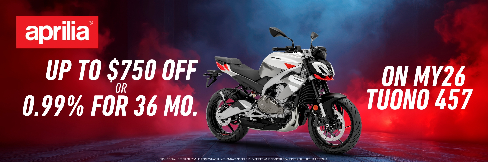 *Performance credit valid on select new, unregistered Aprilia models only. Applicable models include 2025 and prior Tuareg 660 ($500.00), 2024 and prior Tuono 660 ($750.00), and 2026 Tuono 457 ($750). Credit applied at time of purchase through participating authorized Aprilia dealerships. Offer cannot be combined with other promotions, incentives, or discounts. No cash value. Not valid on prior purchases. Dealer participation may vary. Offer is only valid from January 1st, 2026, through January 31st, 2026. Offer subject to change or cancellation without notice. See authorized Aprilia dealer for full details.