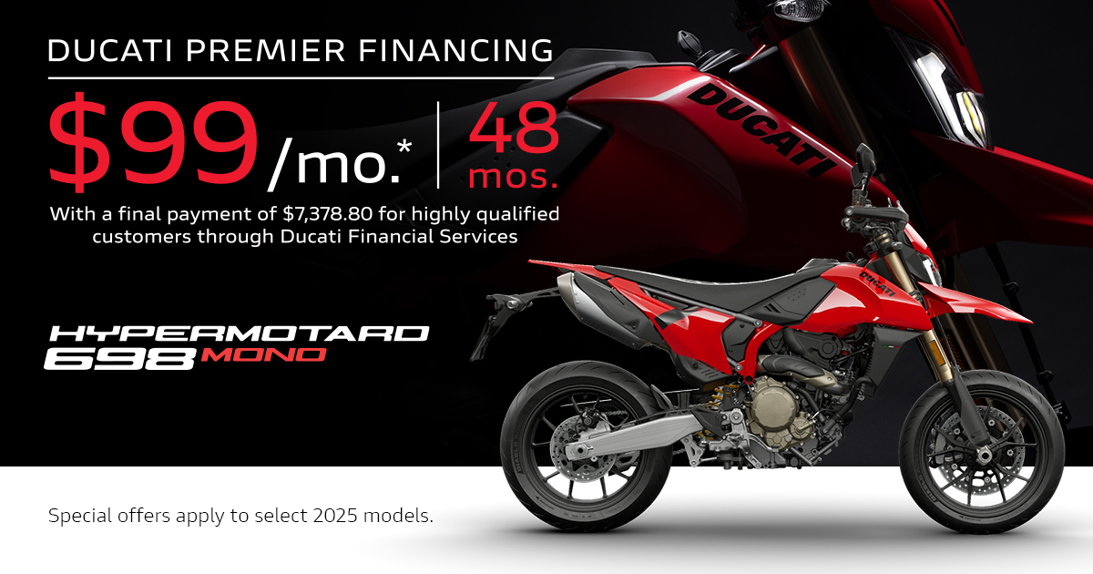 Offer available on select 2025 models to highly qualified customers on approved credit by Ducati Financial Services through participating and authorized Ducati dealers from December 2 - 30, 2025. Payments calculated with a $995 freight & setup. Payments shown exclude tax, title, license, options and dealer fees. Final terms and pricing are subject to negotiation between you and your dealer. APR stated not available in AL, IA, IL, KY, MI, OH, OK, SC & VA. Minimum amount financed of $10,000 to be eligible in MD & HI. Selling price must exceed $10,000 to be eligible in NJ and $7,500 to be eligible in NC. Ducati Premier Financing not available in NH, & PA. See your local Ducati dealer for financing details or, for general product information, call 1-888-391-5446. VW Credit, Inc. dba Ducati Financial Services is a servicer for VCI Loan Services, LLC. © 2025 Ducati North America.