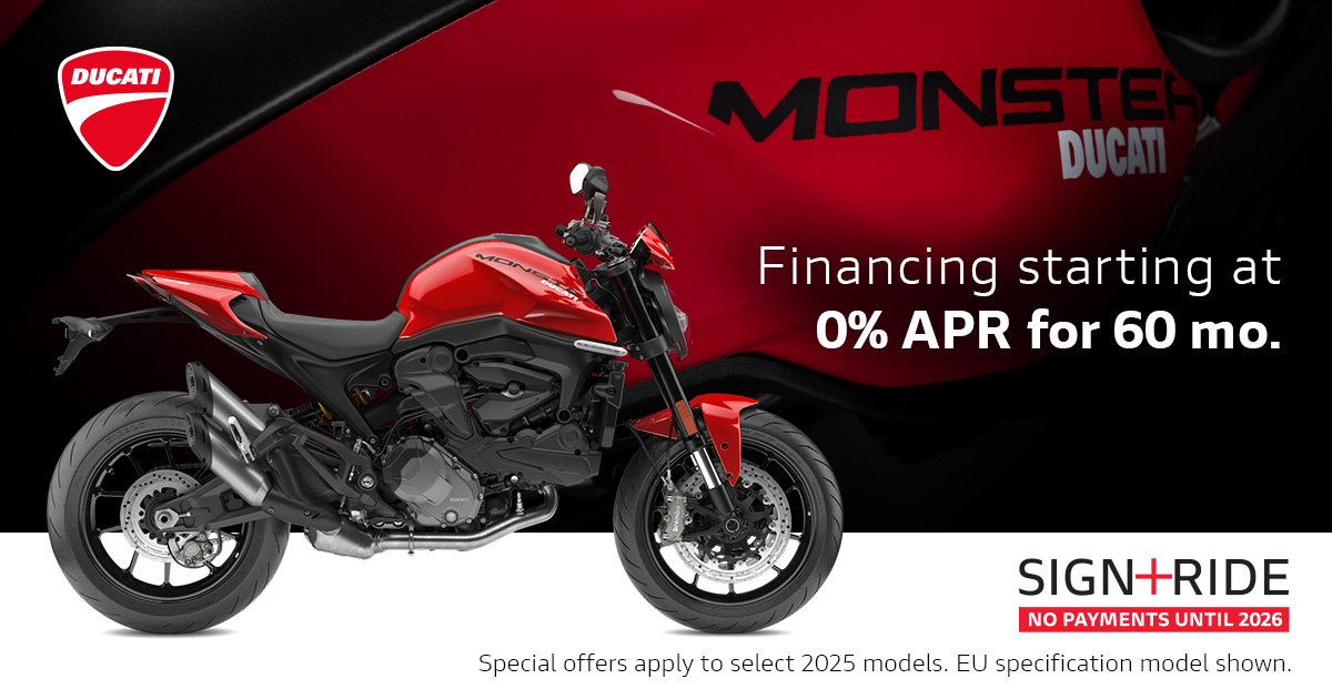Offer available on select 2024 and 2025 models to highly qualified customers on approved credit by Ducati Financial Services through participating and authorized Ducati dealers from September 3 - 30, 2025. Down payment requirement varies from 0%-25% of the purchase price based on credit worthiness. Not all customers will qualify for the advertised APR. Minimum amount financed is $5,000. See your local Ducati dealer for financing details or, for general product information, call 1-888-391-5446. VW Credit, Inc. dba Ducati Financial Services is a servicer for VCI Loan Services, LLC. © 2025 Ducati North America.