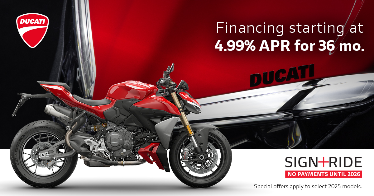 Offer available on select 2024 and 2025 models to highly qualified customers on approved credit by Ducati Financial Services through participating and authorized Ducati dealers from October 1 - 31, 2025. Down payment requirement varies from 0%-25% of the purchase price based on credit worthiness. Not all customers will qualify for the advertised APR. Minimum amount financed is $5,000. See your local Ducati dealer for financing details or, for general product information, call 1-888-391-5446. VW Credit, Inc. dba Ducati Financial Services is a servicer for VCI Loan Services, LLC. © 2025 Ducati North America.