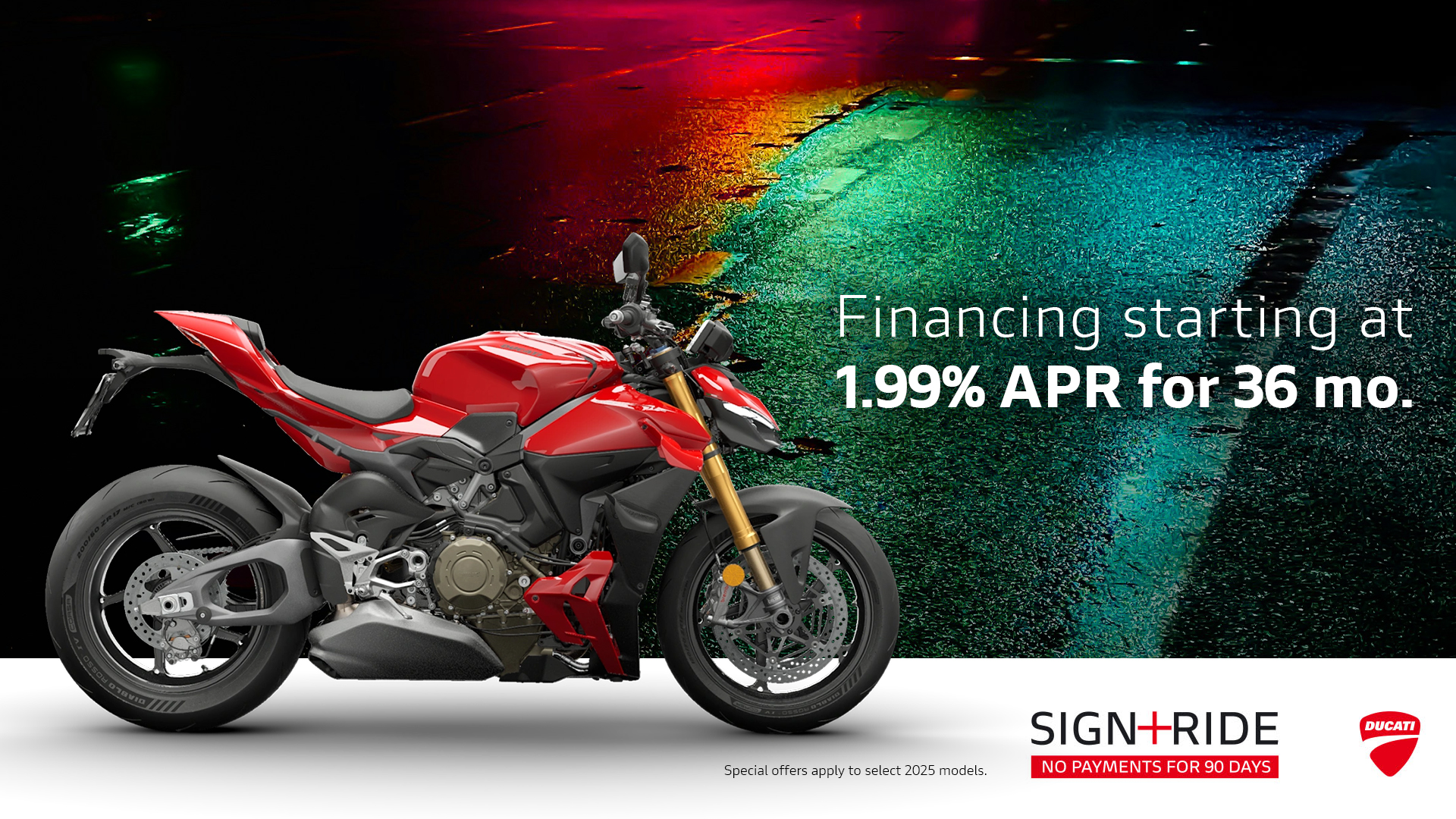 Offer available on select 2025 models to highly qualified customers on approved credit by Ducati Financial Services through participating and authorized Ducati dealers from January 6 - 31, 2026. Down payment requirement varies from 0%-25% of the purchase price based on credit worthiness. Not all customers will qualify for the advertised APR. Minimum amount financed is $5,000. See your local Ducati dealer for financing details or, for general product information, call 1-888-391-5446. VW Credit, Inc. dba Ducati Financial Services is a servicer for VCI Loan Services, LLC. © 2025 Ducati North America.